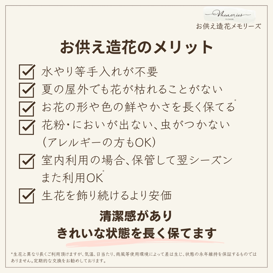 季節を問わず、お手入れ・水替え不要、猛暑の夏場でも枯れることなく、美しさを長く保ってくれます。長期不在時、お墓参りに頻繁に行くことが困難な方や暑い時期や長期不在時にお勧めです。