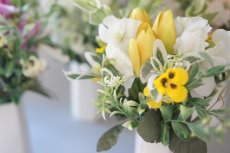 チューリップやスイートピーなど春のお花を束ねた華やかなデザインです。